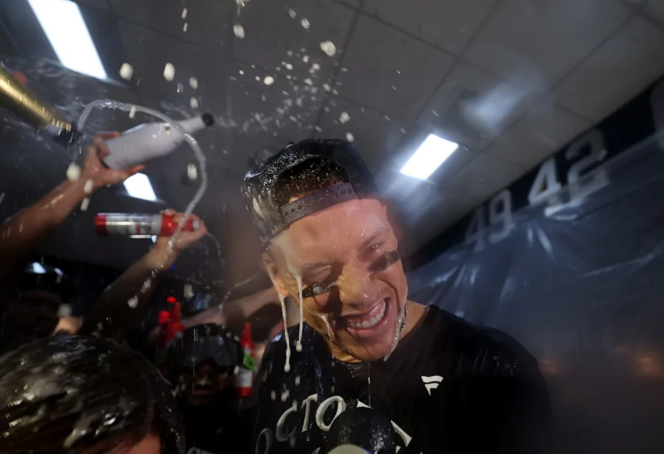 Aaron Judge of the New York Yankees celebrates in the locker room after clinching a 2025 MLB playoffs spot in a walk-off win against the Chicago White Sox at Yankee Stadium on Sept. 23, 2025, in New York.