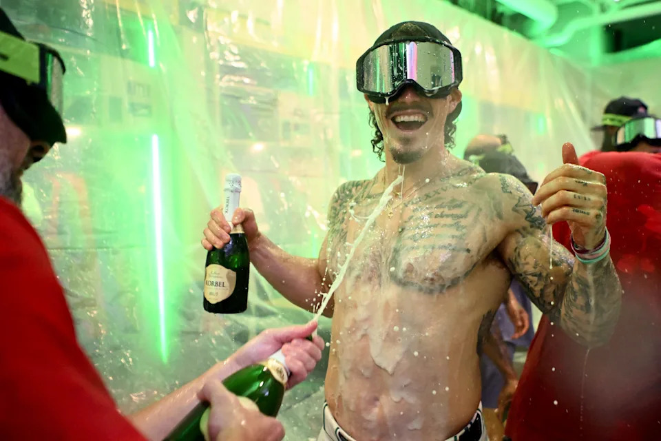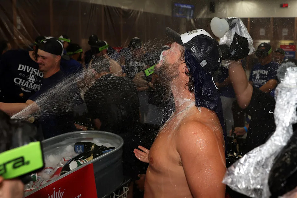 Clayton Kershaw of the Los Angeles Dodgers celebrates in the locker room after defeating the Arizona Diamondbacks 8-0 to clinch the NL West division title at Chase Field on Sept. 25, 2025 in Phoenix.