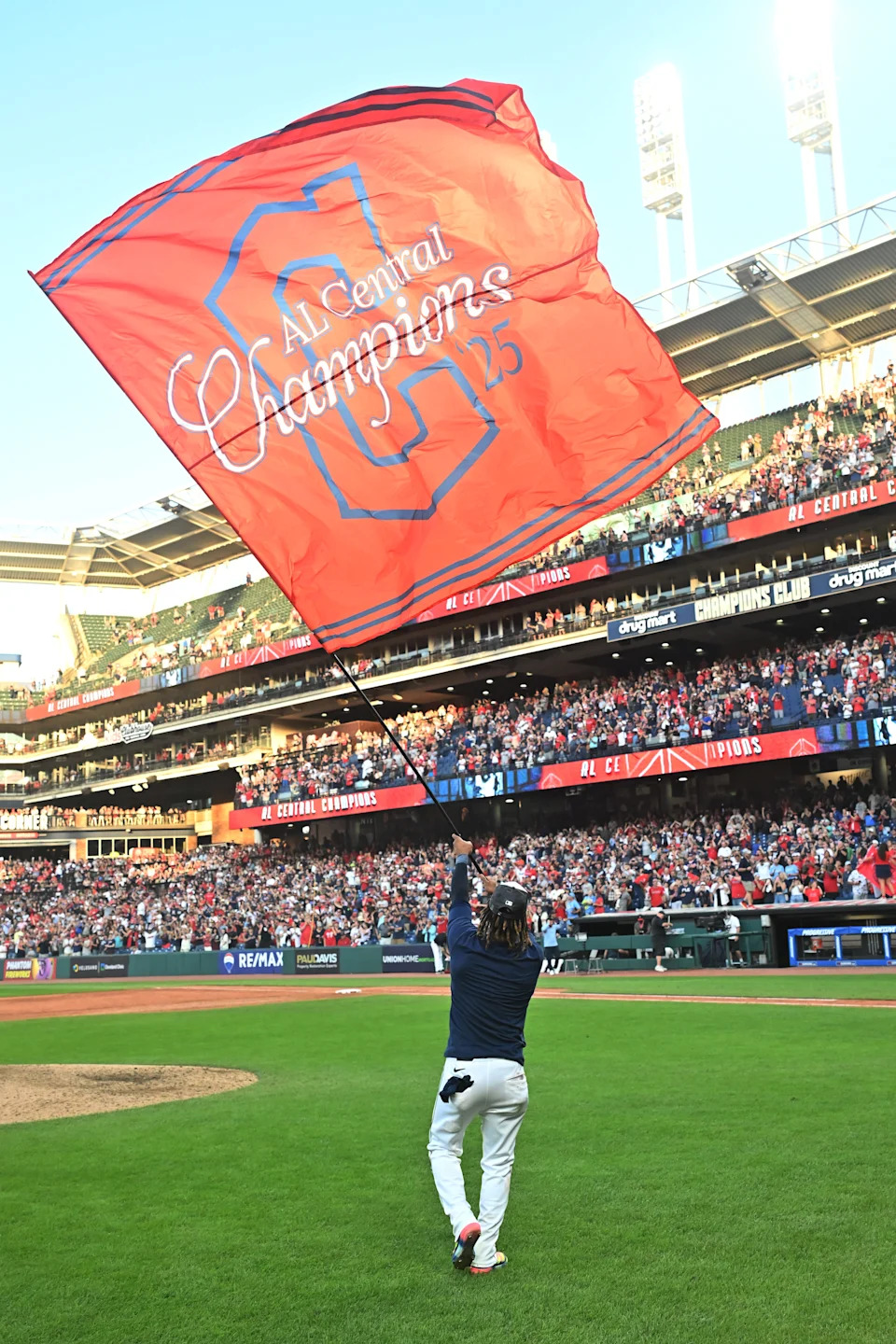 Cleveland Guardians third baseman Jose Ramirez (11) waves the flag after the Guardians beat the Texas Rangers and won the American League Central Division on Sept. 28 at Progressive Field.
