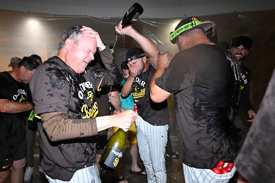 San Diego Padres manager Mike Shildt celebrates with players after the Padres clinched a spot in the 2025 MLB playoffs by beating the Milwaukee Brewers at Petco Park in San Diego on Sept. 22, 2025.