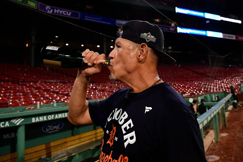 Detroit Tigers assistant pitching coach Juan Nieves takes a sip of champagne after defeating the Boston Red Sox on Sept. 27 at Fenway Park.