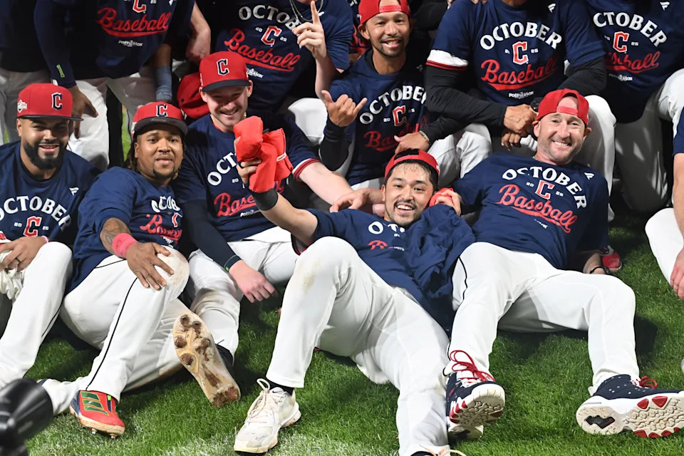 The Cleveland Guardians pose for a photo after they beat the Texas Rangers to secure a playoff berth on Sept. 27 at Progressive Field.