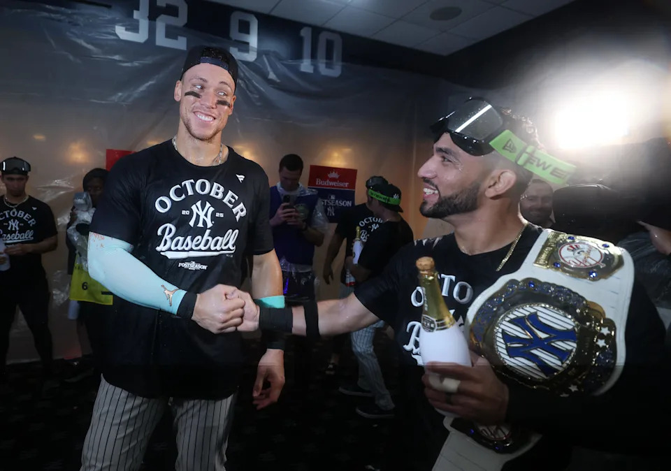 Aaron Judge of the New York Yankees celebrates with Jose Caballero in the locker room after clinching a 2025 MLB playoffs spot in a walk-off win against the Chicago White Sox at Yankee Stadium on Sept. 23, 2025, in New York.