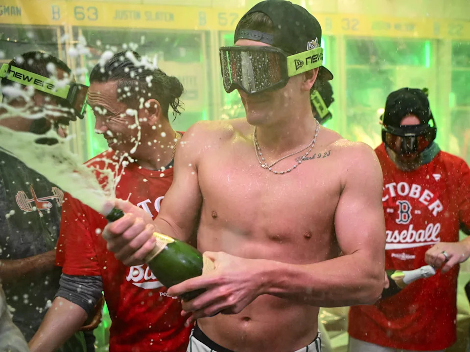 Roman Anthony of the Boston Red Sox celebrates in the clubhouse after defeating the Detroit Tigers during the ninth inning at Fenway Park to clinch a spot in the 2025 MLB postseason on Sept. 26, 2025, in Boston.