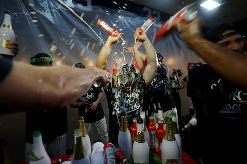 The New York Yankees celebrate in the locker room after clinching a 2025 MLB playoffs spot in a walk-off win against the Chicago White Sox at Yankee Stadium on Sept. 23, 2025, in New York.