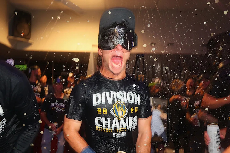 Sal Frelick of the Milwaukee Brewers celebrates clinching the 2025 NL Central division title with a win over the St. Louis Cardinals at Busch Stadium on Sept. 21, 2025, in St. Louis.