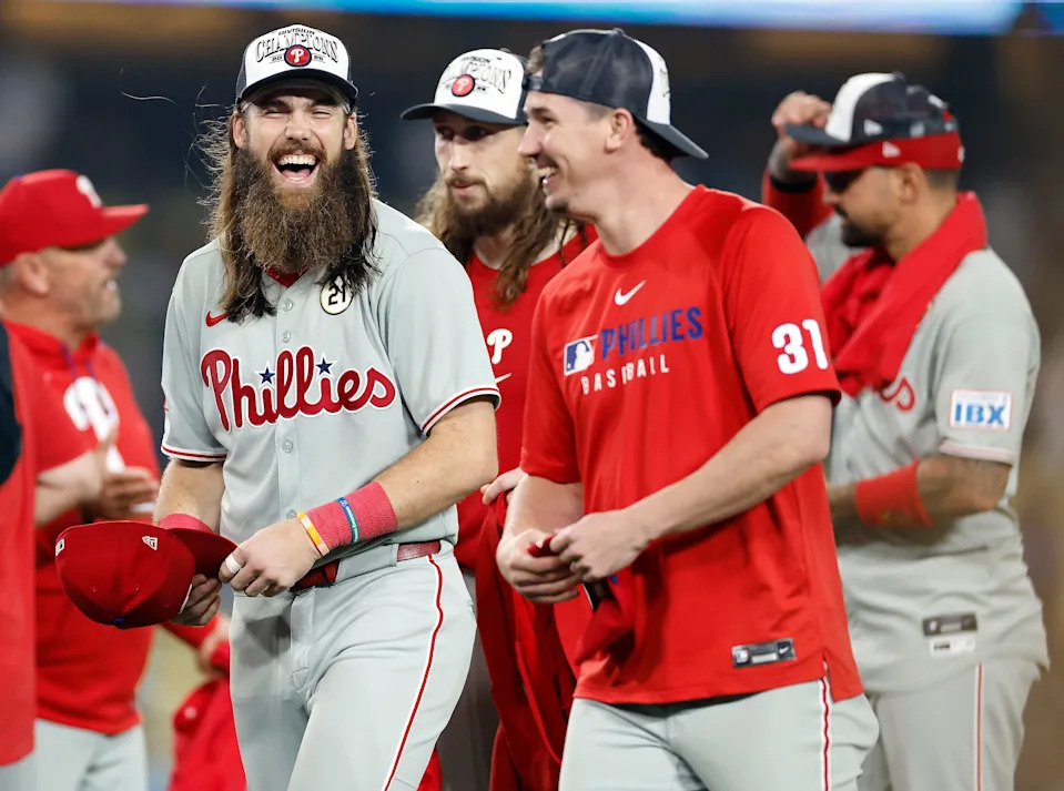 Brandon Marsh and Walker Buehler of the Philadelphia Phillies celebrate clinching the NL East division with a win over Los Angeles Dodgers at Dodger Stadium on Sept. 15, 2025, in Los Angeles.