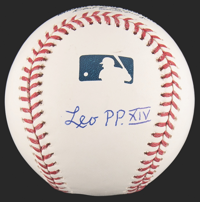 The Rawlings Official Major League (Manfred) baseball bears a blue ballpoint autograph on a side panel, signed “Leo PP. XIV.”