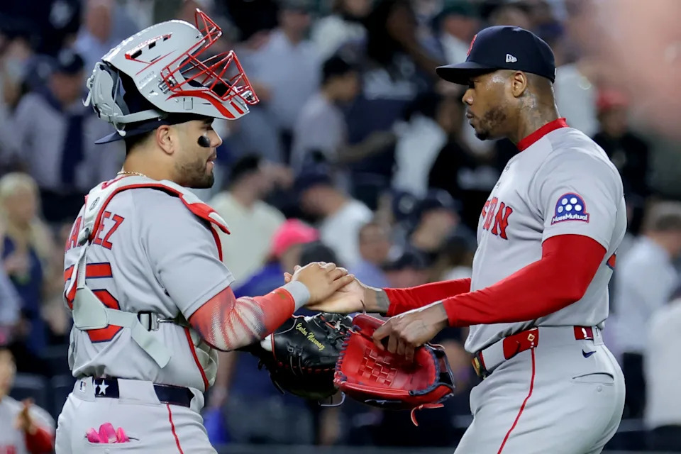 Red Sox catcher Carlos Narvaez and relief pitcher Aroldis Chapman celebrate after defeating the Yankees 3-1 in Game 1 at Yankee Stadium.