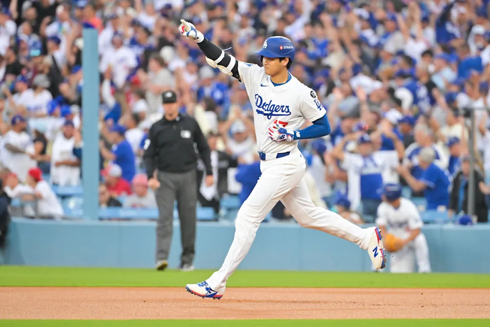 Shohei Ohtani celebrates after hitting a home run during the first inning against the Reds during Game 1.