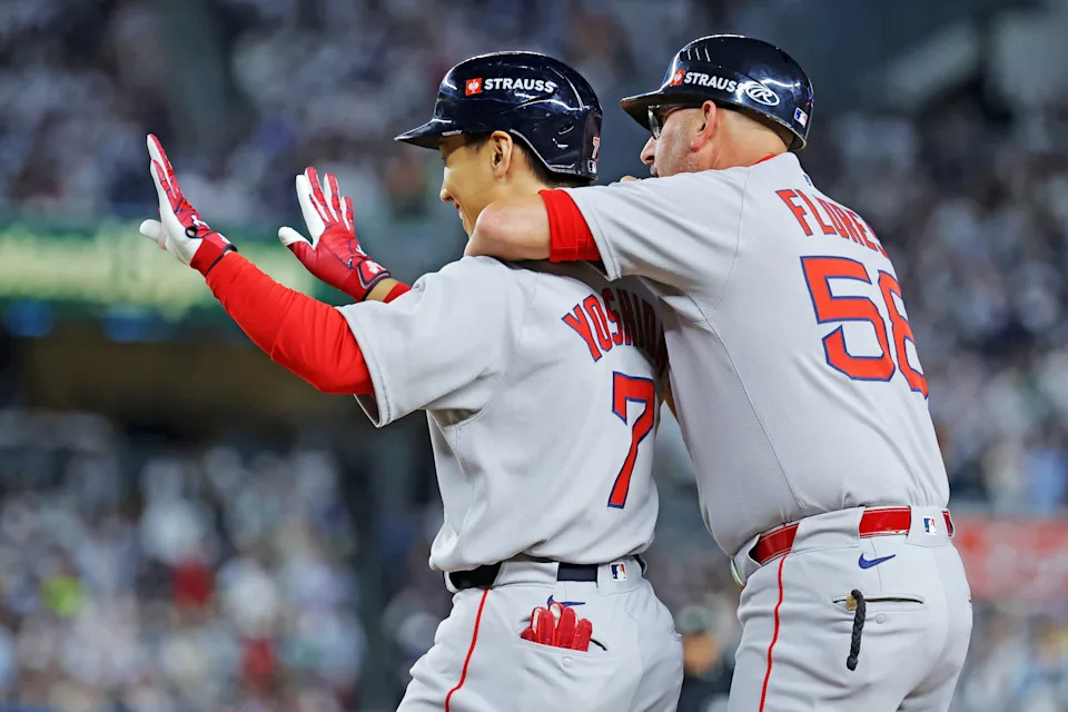 Masataka Yoshida celebrates with first base coach José David Flores after hitting a two-run single during the seventh inning of Game 1.