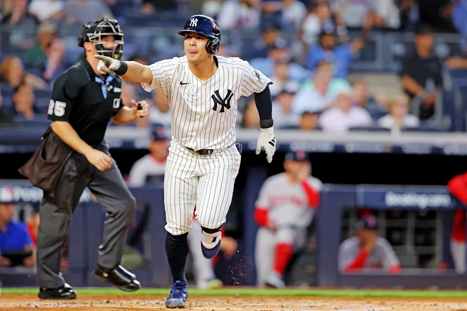 Anthony Volpe reacts after hitting a solo home run during the first inning of Game 1 against the Red Sox.