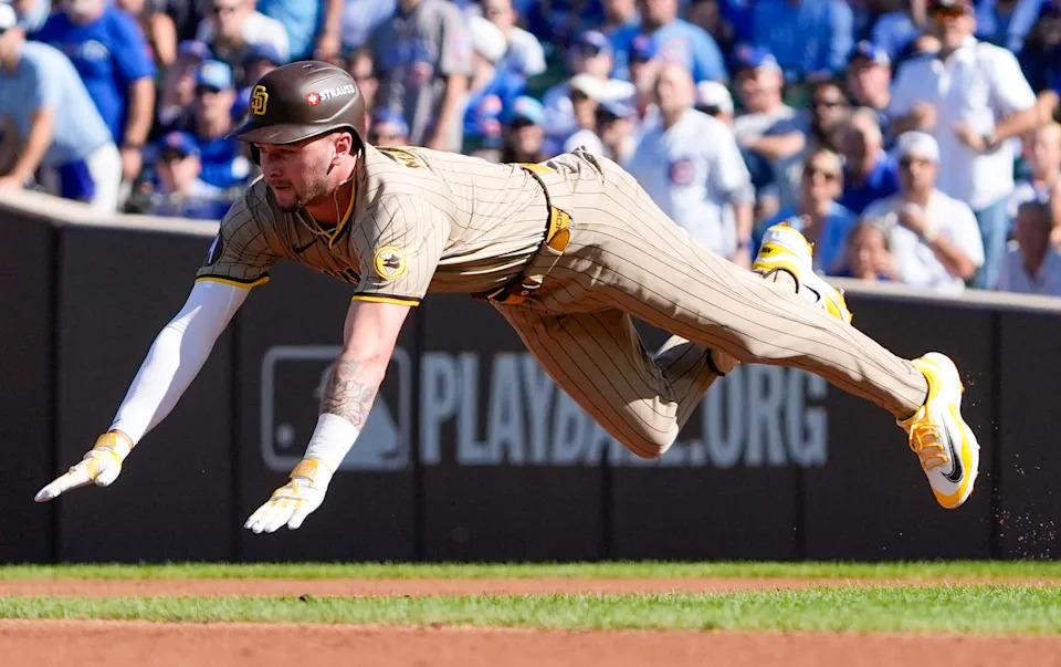 Padres outfielder Jackson Merrill slides into second base for a double in the second inning of Game 1 against the Cubs.