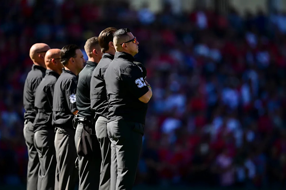 Umpires stand for “God Bless America” during Game 1 between the Guardians and Tigers at Progressive Field.