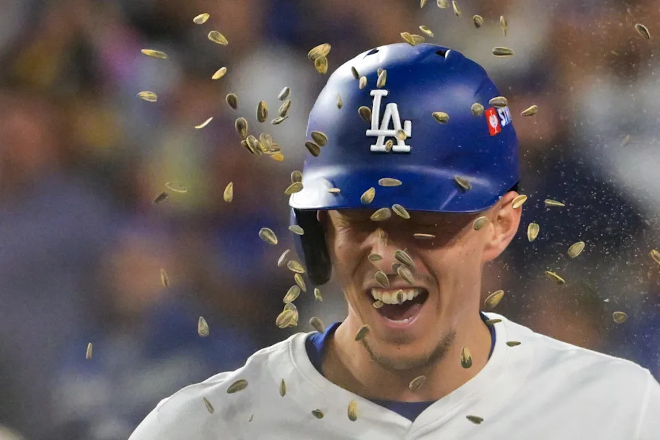 Tommy Edman is showered with sunflower seeds after hitting a home run during the third inning against the Reds in Game 1.