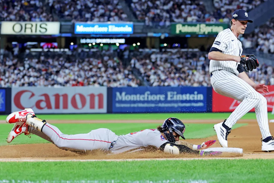 Jarren Duran is out at first with Yankees pitcher Max Fried covering during the fifth inning of Game 1.