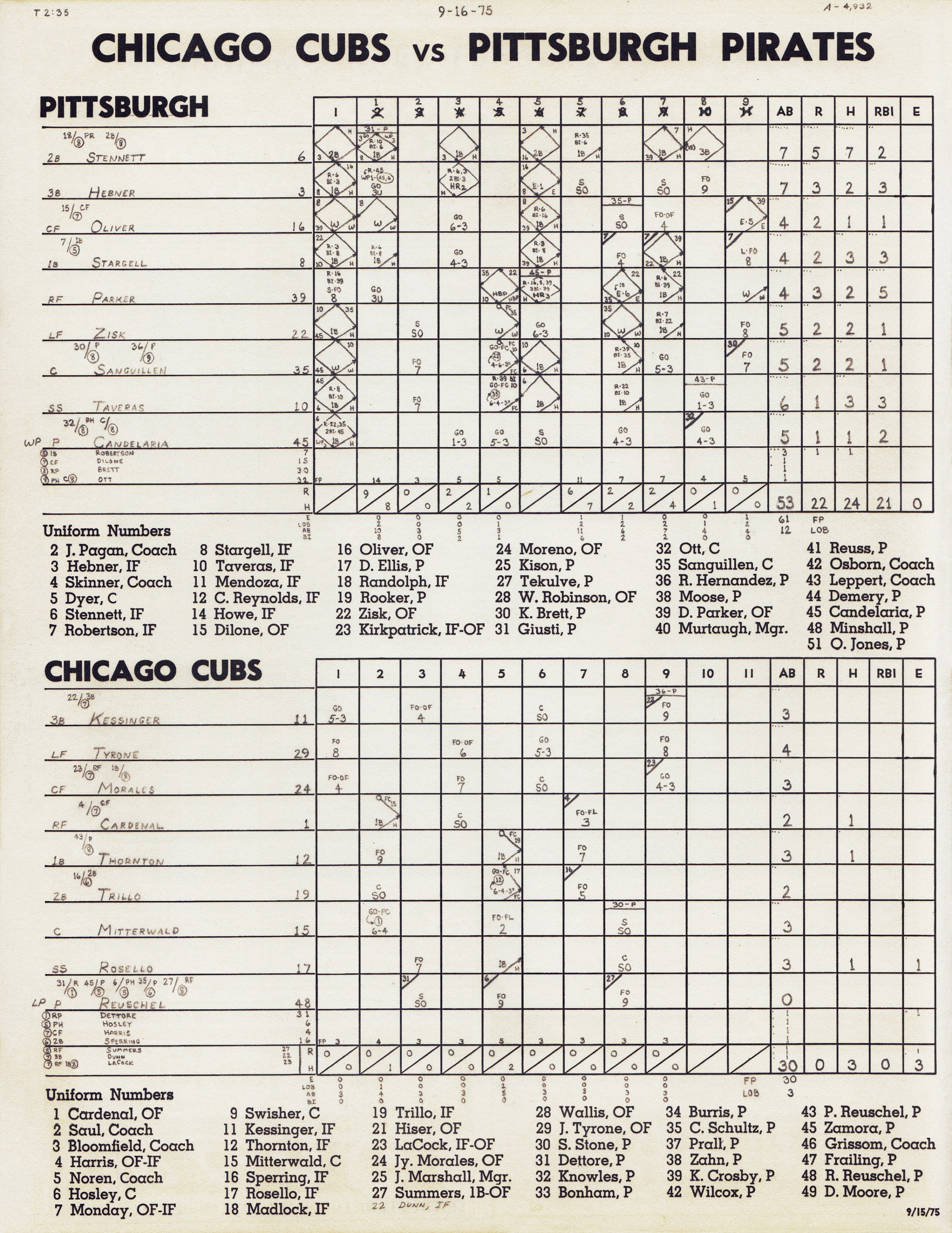 Every Pirates starting player had at least one hit and scored at least one run, including starting pitcher John Candelaria, who threw a three-hit shutout. The Cubs’ three hits, all singles, were by Jose Cardenal, Andre Thornton and Dave Rosello.