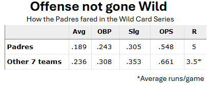The Padres were not the only team to struggle at the plate in the Wild Card round. Three teams had a lower OPS, only one team had more extra-base hits. But no team had a lower on-base percentage or scored fewer runs.