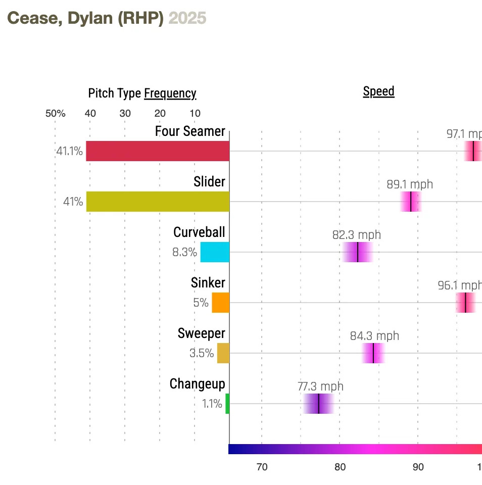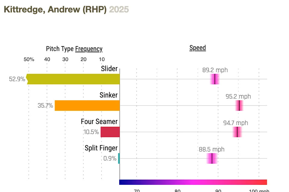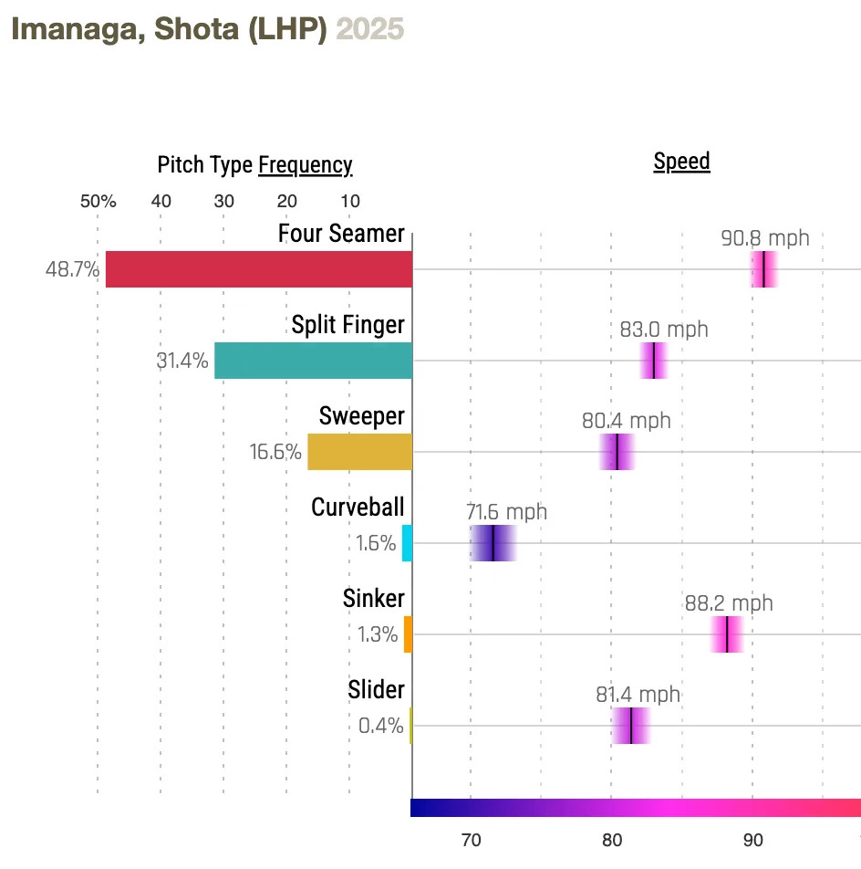 While nothing has been officially announced, it is widely assumed that Shōta Imanaga will follow Kittredge and throw 4-5 innings. Thus I am going to give you pitch charts for both Kittredge and Imanaga below.