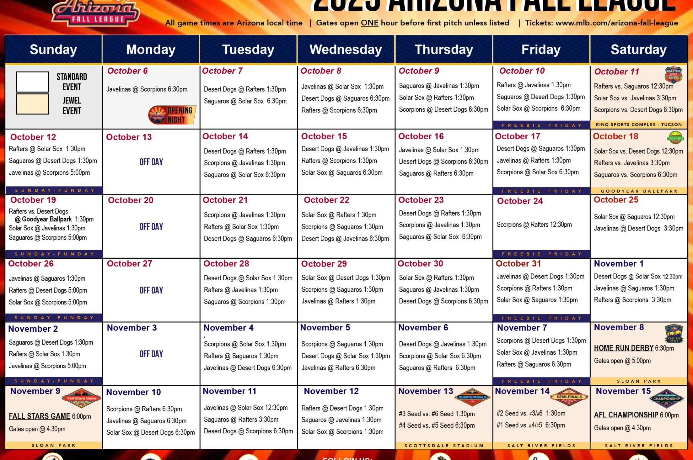 The Arizona Fall League website also streams all the games throughout the season. The Peoria Javelinas will play the Scottsdale Scorpions on Oct. 6 and that is the only game the first day. All other teams begin their schedules on Oct. 7 and Peoria will be off.