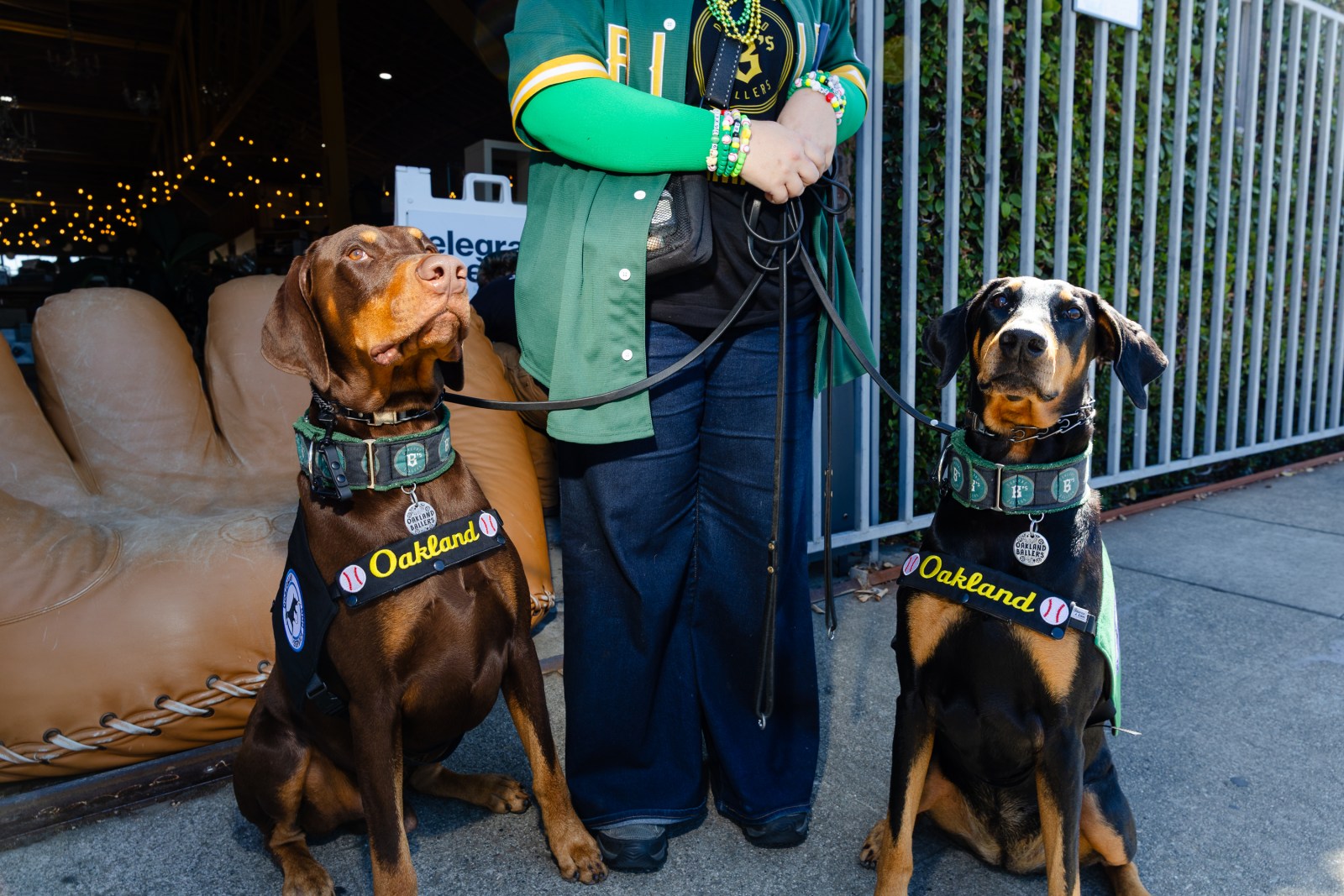 Colt Rosensweig, 39, holds super fan service dogs Curtis, left, and Caris, right, during the Ballers parade. Estefany Gonzalez for The Oaklandside