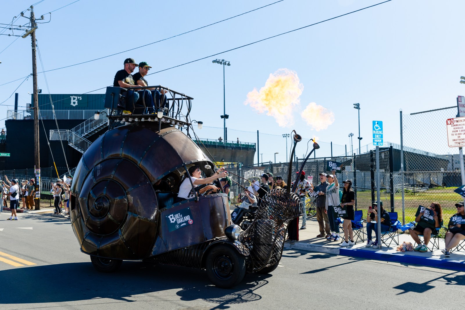 A giant metal snail, built at the Crucible, a local arts nonprofit, carred the Ballers’ two founders, Bryan Carmel and Paul Freedman. Credit: Estefany Gonzalez for The Oaklandside