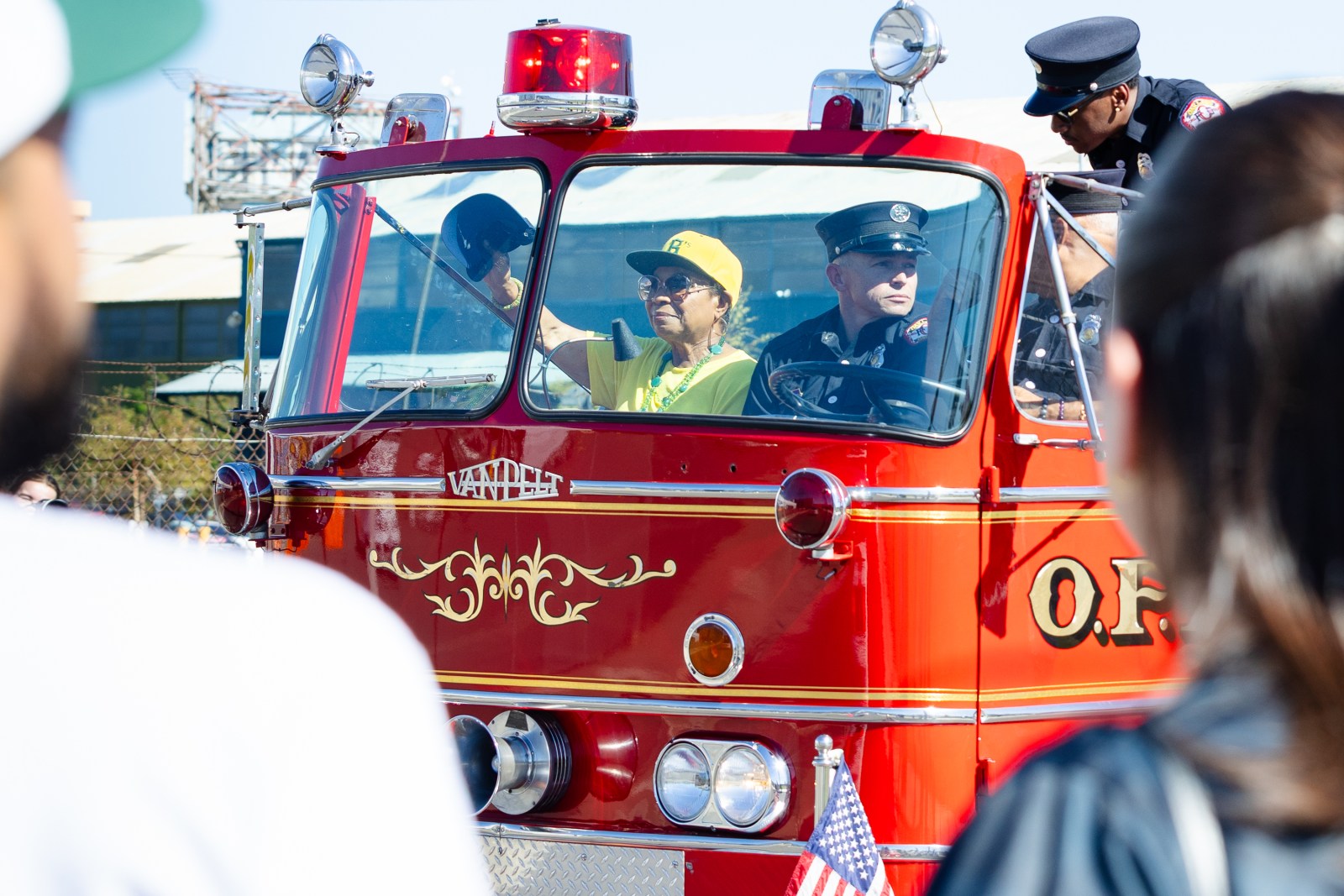 Oakland Mayor Barbara Lee, in yellow, waved to fans from an Oakland fire truck. Credit: Estefany Gonzalez for The Oaklandside