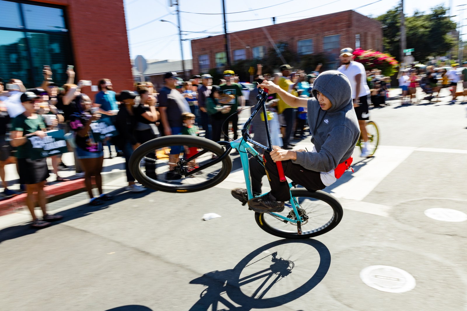 A parade participant pops a wheelie during the parade. Credit: Estefany Gonzalez for The Oaklandside