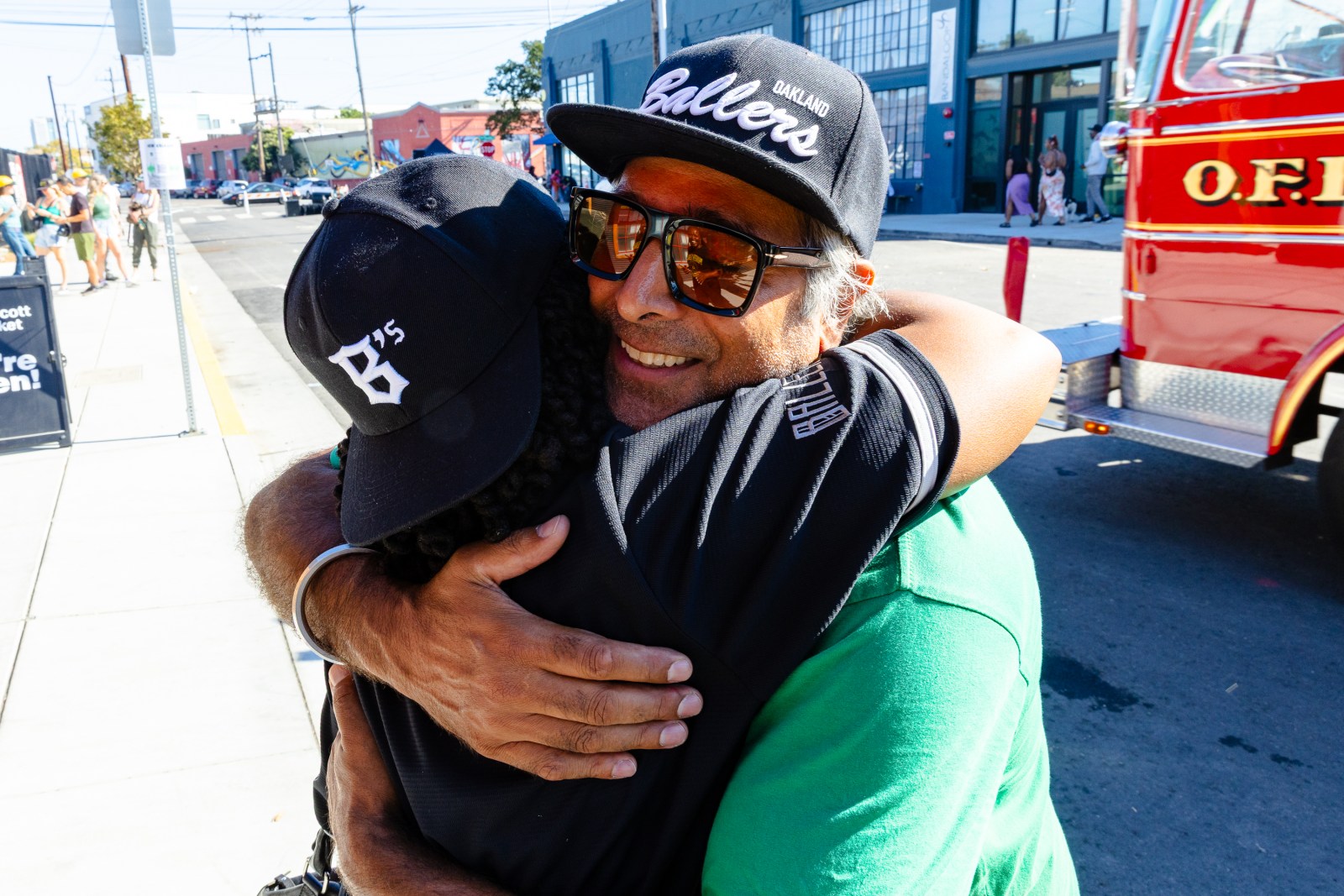 Prescott Market director Harvindar “Harv” Singh, right, hugs Councilmember Fife during a celebration for the Oakland Ballers after the parade at Prescott Market. Estefany Gonzalez for The Oaklandside