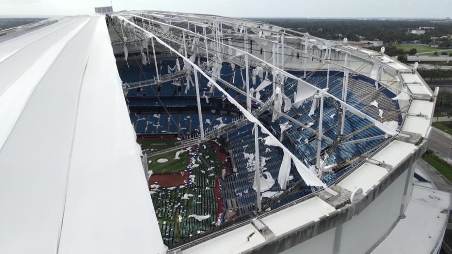 The roof of Tropicana Field ripped off from Hurricane Milton.