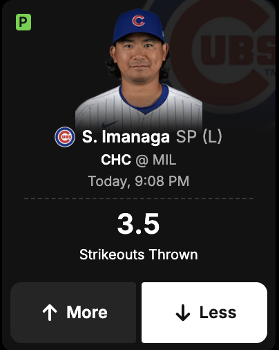 The Brewers proved their offense is playoff-ready and capable of pouring on runs in the series opener. Look for them to do the same in this matchup and chase Imanaga from the matchup early. While he has only been held to fewer than 3.5 strikeouts in seven of his 25 starts this year, Milwaukee is a high-contact team, and Imanaga has looked especially worrisome of late. Count on him being chased from the game before he can strike out more than three hitters tonight.