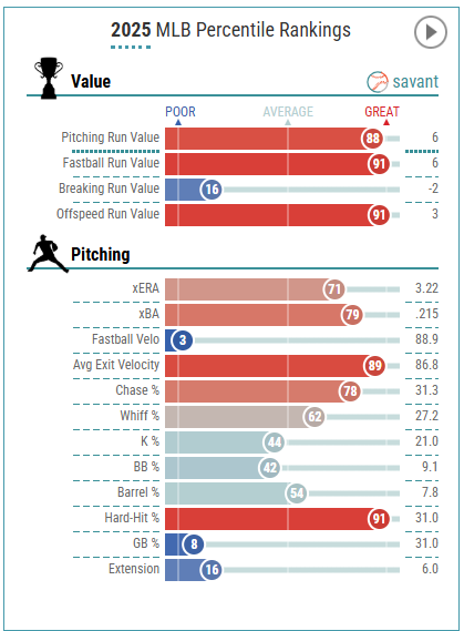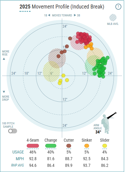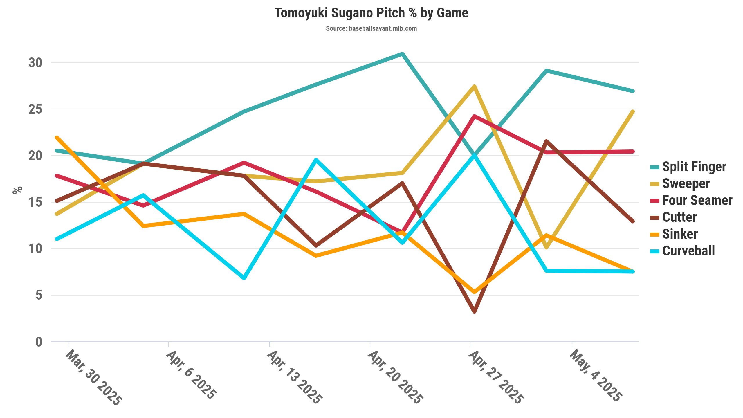 Sugano has become an intriguing option for fantasy players to consider on their roster. If you are looking for strikeouts, he is not the guy. He has only 29 in 52 innings pitched this season. If you’re looking for someone who gets wins and control ratios, Sugano might be your guy. He has four wins in nine starts and has a 3.08 ERA and 1.03 WHIP. As you can see below, he does it by using a six-pitch mix that keeps hitters off-balance and chasing his pitches. Remember that his xERA is a run-and-a-half higher than it is now, so some regression could be coming. But enjoy the ride.