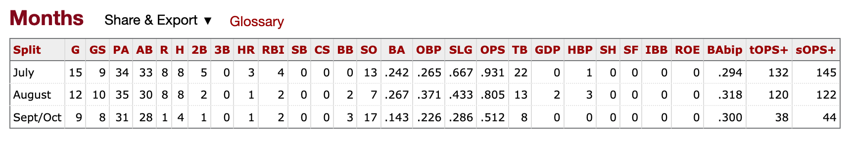 It wasn’t all fun and games. As catchers came back off the IL, Jackson saw his playing time diminish down the stretch, and so did his offense. Here are his monthly splits, courtesy of Baseball Reference: