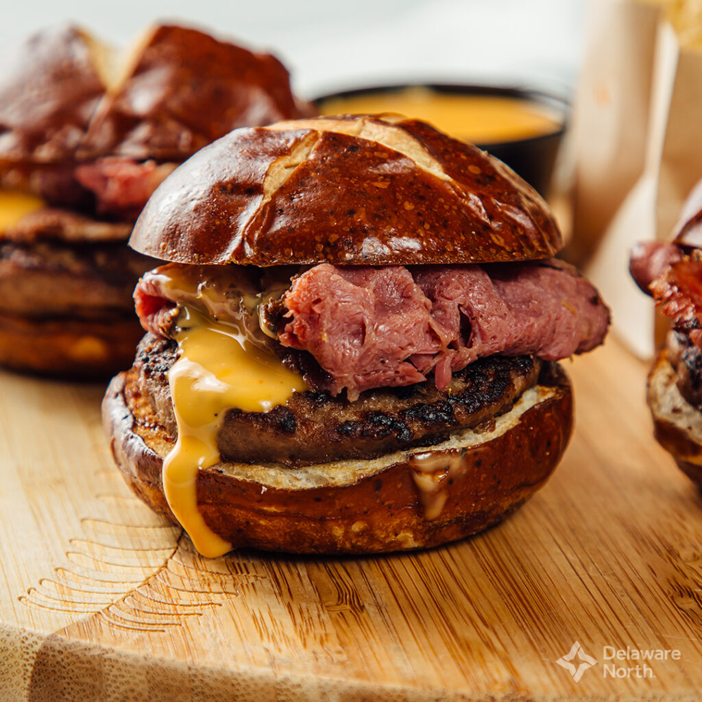 Pretzel Beer Cheese Sliders – All-beef patty, pastrami, beer cheese on a Hawaiian bun.