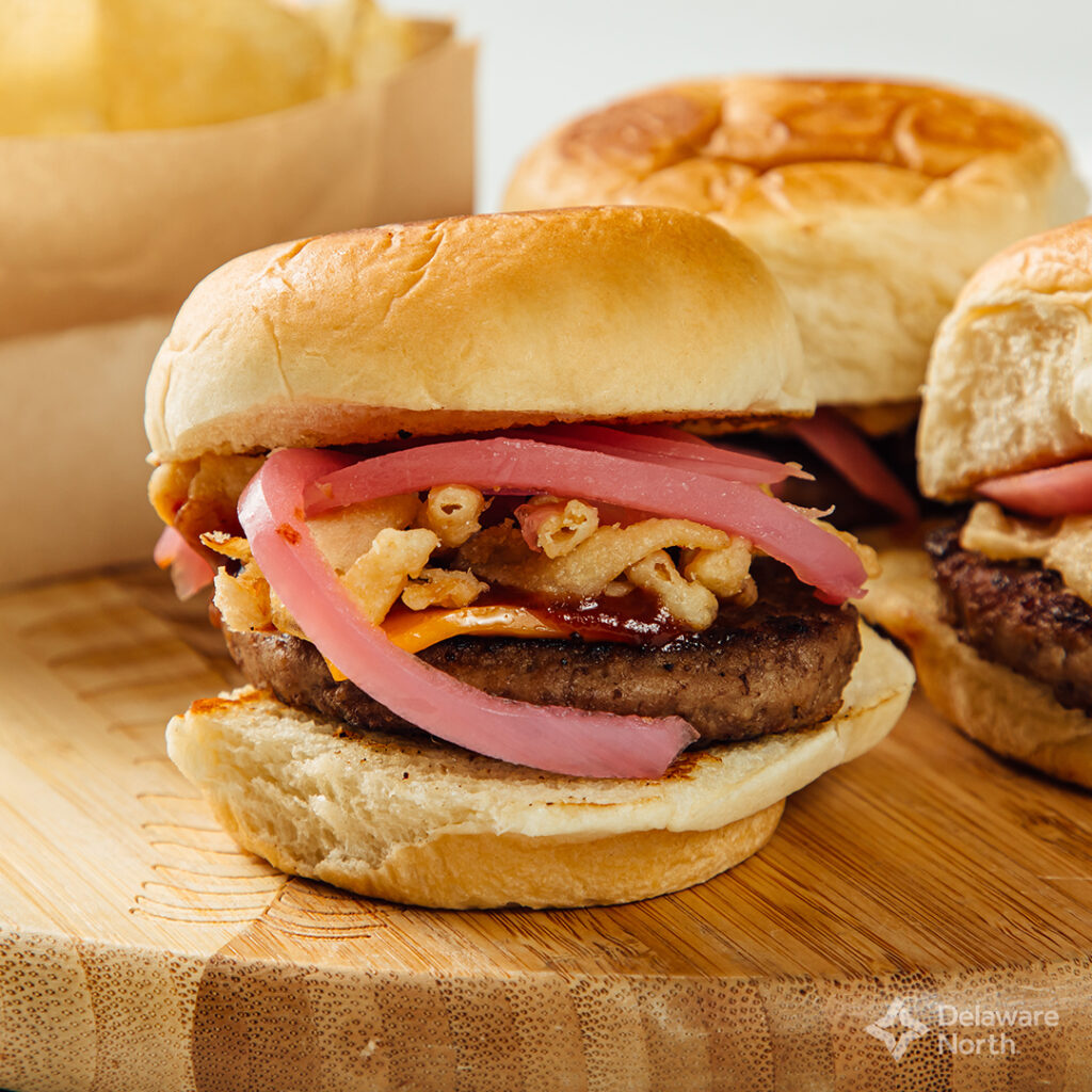 Rodeo Sliders – Beef patty, cheddar cheese, crispy onions, BBQ sauce on a Hawaiian bun.