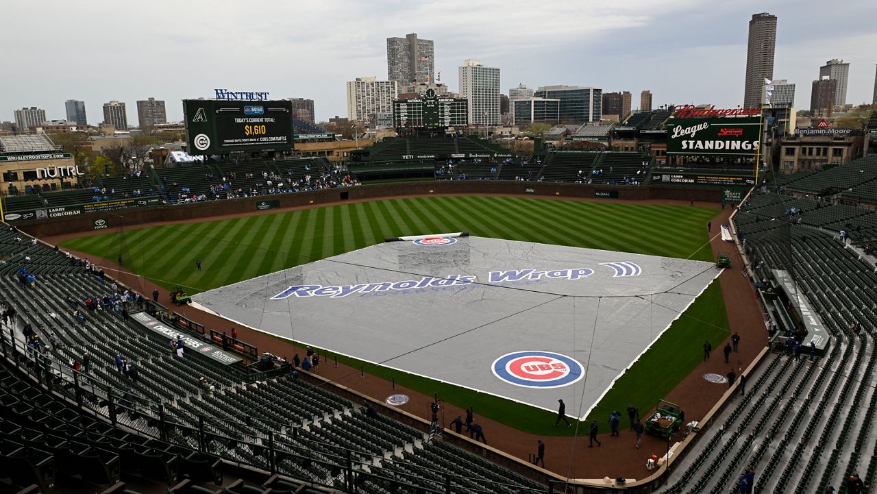 A rain tarp covers the infield at Wrigley Field in Chicago. (AP Photo/Paul Beaty)