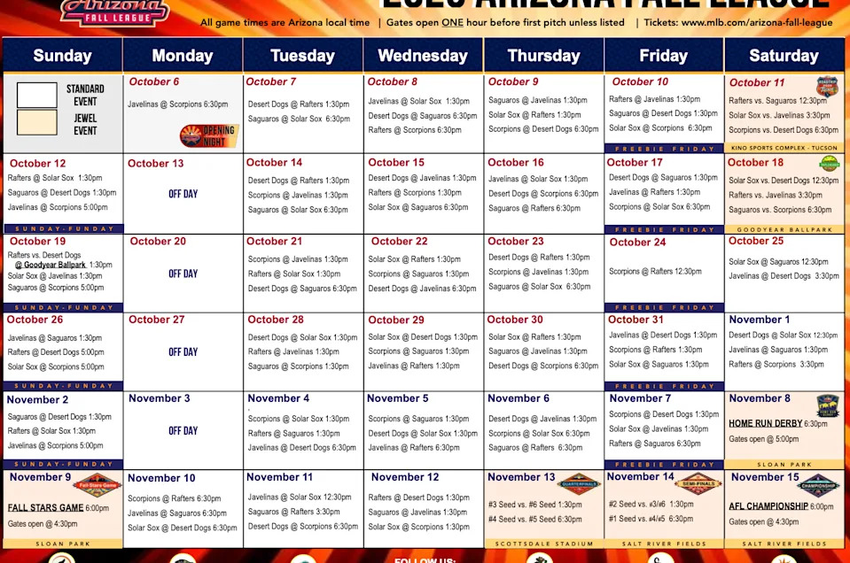 The AFL’s alumni list is a who’s who of big-league talent, including more than 3,000 major leaguers who have passed through the Arizona desert. If you want to see tomorrow’s stars before they’re famous, get your tickets and head to the Grand Canyon, because this fall, it is the place to be.
