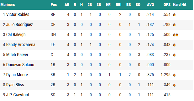 Win one came in early April, home in Seattle, with the second during Seattle’s obliteration of the Detroit Tigers just before the All-Star Break. The April game, Seattle’s top of the order looked fairly familiar, but the six through eight were all absent in October.