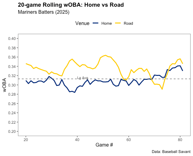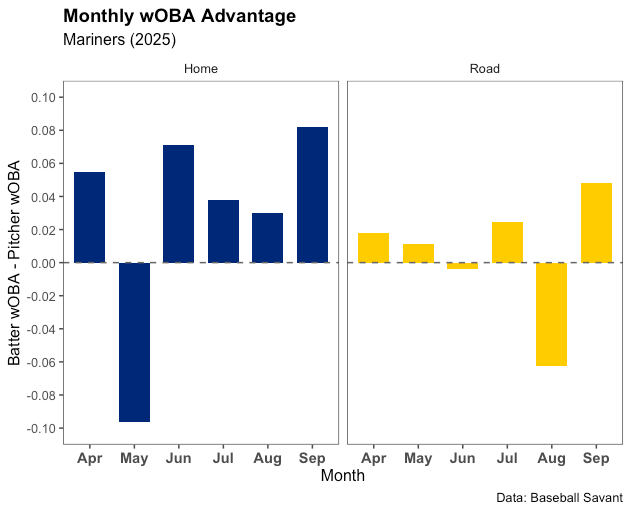 Sort of. Their 25-point wOBA advantage at home ranked eighth in MLB in 2025. Their 8-point wOBA advantage on the road ranked seventh in MLB (or roughly equivalent, in a relative sense). In other words, the Mariners weren’t bad on the road, so much as most teams take a penalty as the visitors.