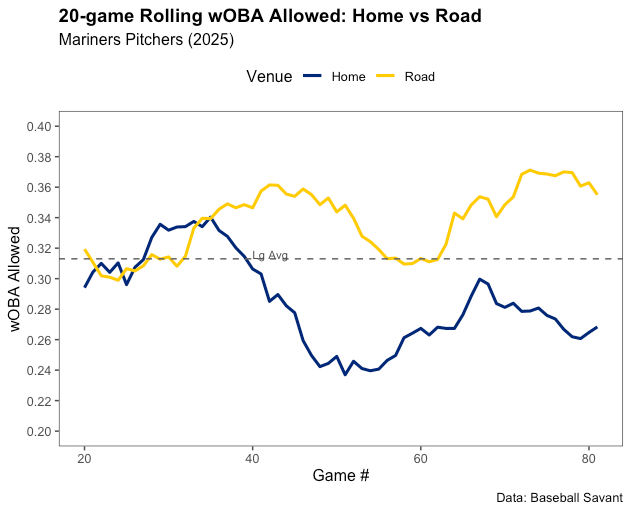 The Mariners pitched poorly on the road in 2025. Their 4.34 FIP in away games this year ranked 21st in MLB, compared to a 3.63 FIP at home (6th). The only pitcher to truly excel on the road in 2025 was Andrés Muñoz (in fact, he was even better away). George Kirby, Bryan Woo and Gabe Speier were each solid outside T-Mobile Park, but everyone else was league average or worse.