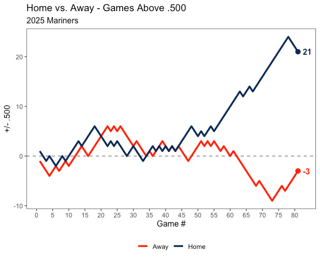 Not quite. Their lackluster record in away games this year seemed more a “feature” of their wild inconsistency, rather than an inherent… road block. In fact, the Mariners thrived in away games early in the season, going 14-4 in a stretch that spanned three trips in April and May. They also capped the year with a 7-2 record in their final three series away.