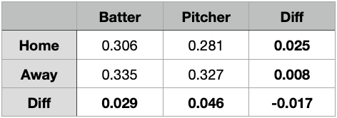 While the Mariners gained about 29 points of wOBA in away games on offense, they gave back about 46 points on defense. Their wOBA advantage dropped from +25 points at home to +8 on the road, or a penalty of about 17 points.