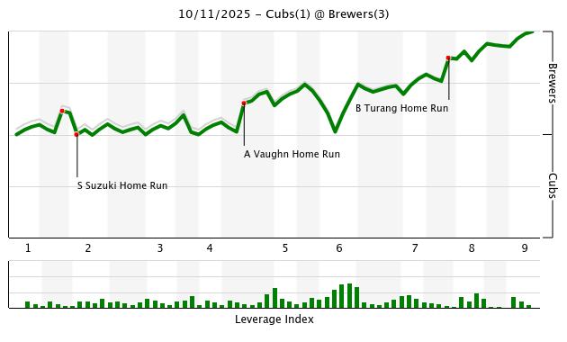 In the end, they made the plays and the Cubs just didn’t come up with enough. You win classy and you lose classy. I tip the cap to the Brewers. They played their asses off. There wasn’t a thing in the decisive game to give even a whiff of any kind of sign stealing, legally or not. Three times they took a Cub pitcher deep. Call them mistakes. Call them winning matchups. Whatever. William Contreras and Andrew Vaughn have been their most significant thump and they were again in this one. Kyle Tucker missed a center cut fastball with two on and no outs in the sixth. Their guys came through. Ours didn’t.