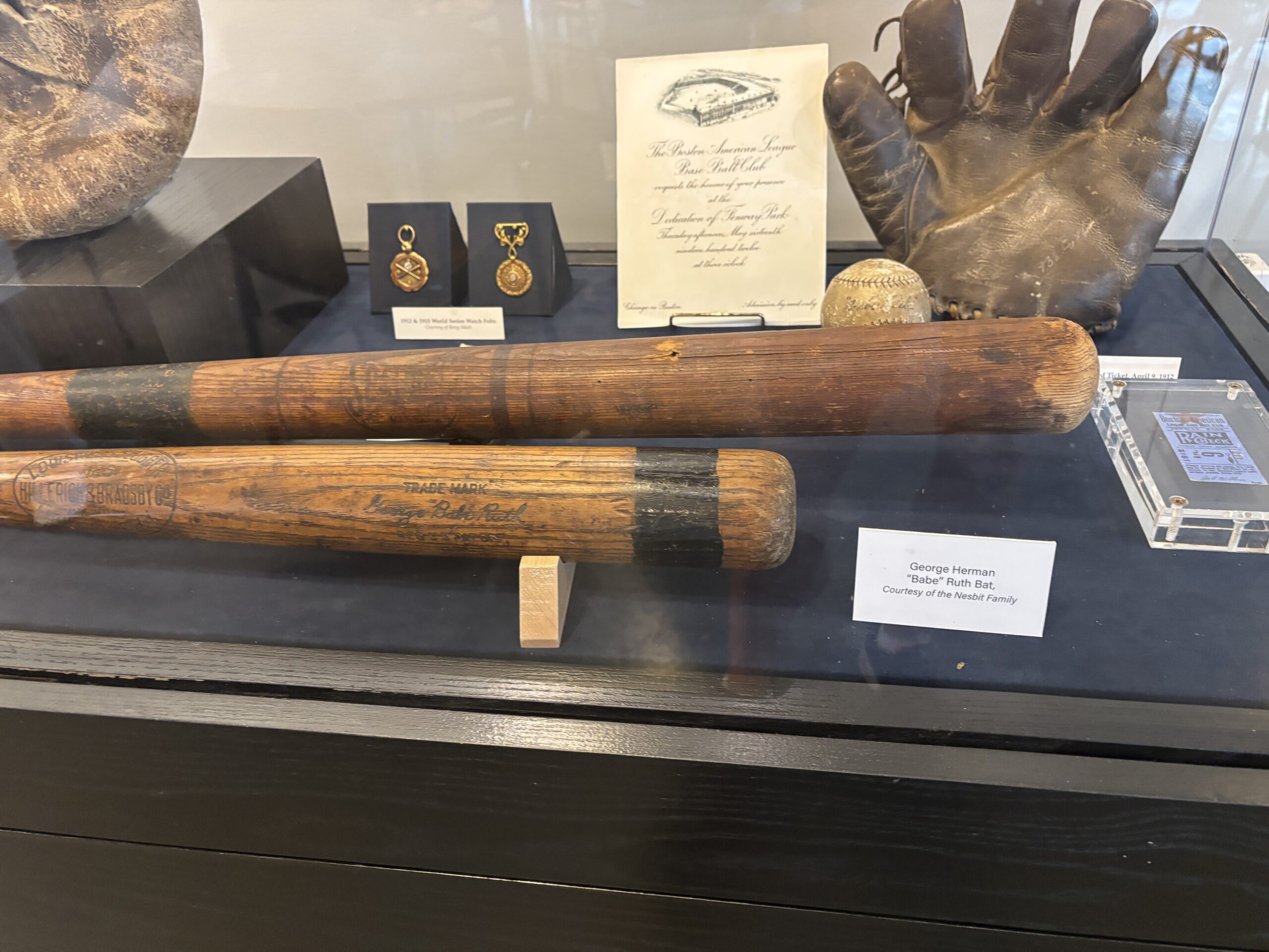 There’s also a bat from Babe Ruth, who starred as a pitcher and outfielder for the Red Sox before being shipped to the hated Yankees in 1920, prompting the “Curse of the Bambino.” The Red Sox won the World Series four times between 1912-18, but then not again until 86 years later in 2004.