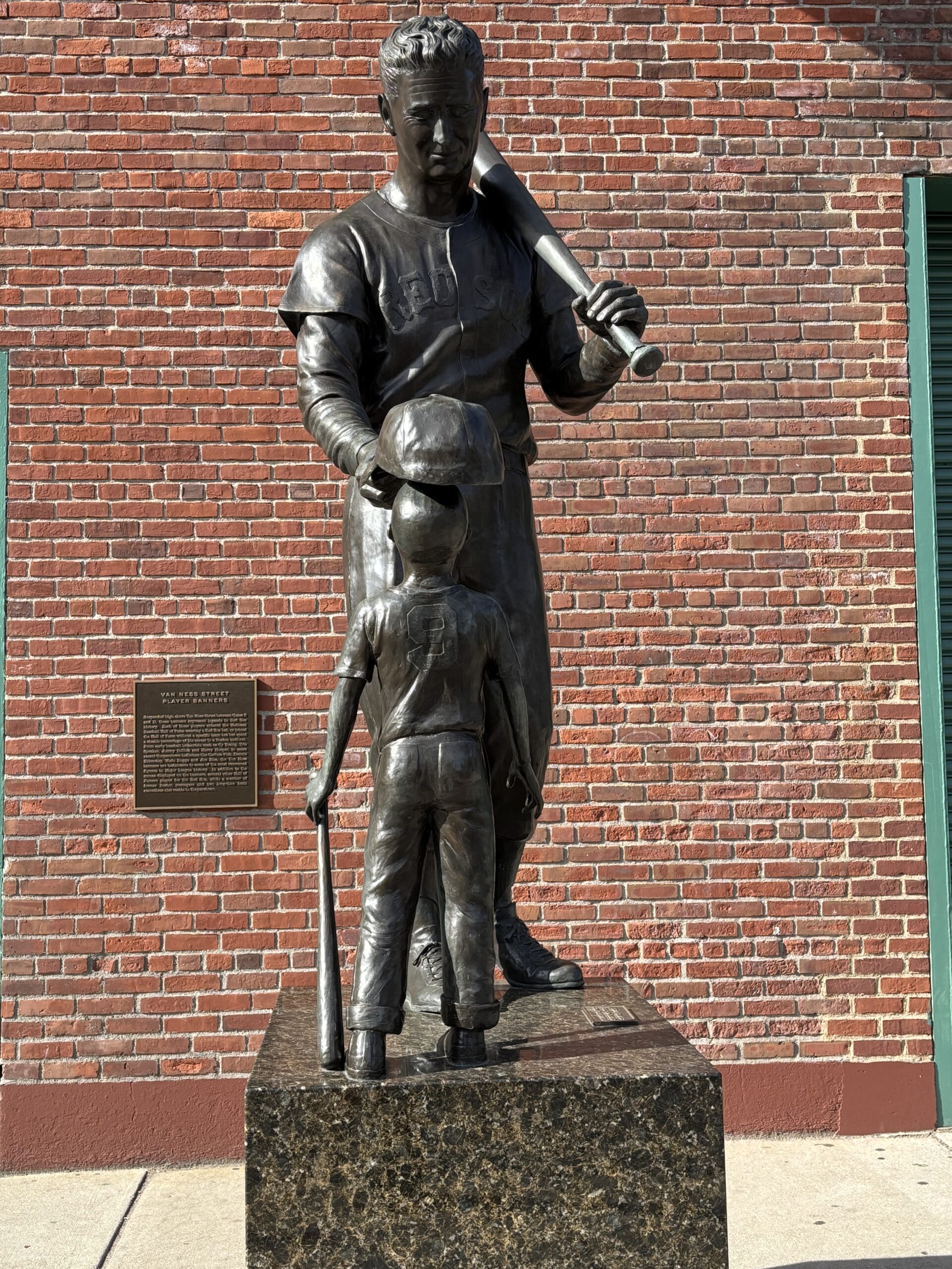 We came across three statues behind the stadium along Van Ness Street. One is Ted Williams and a small boy, a second Carl Yazstremski. The third is called “The Teammates.” It features Red Sox legends Williams, Pesky, Bobby Doerr and Dom DiMaggio, all of whom hailed from the West Coast and played together for seven seasons.