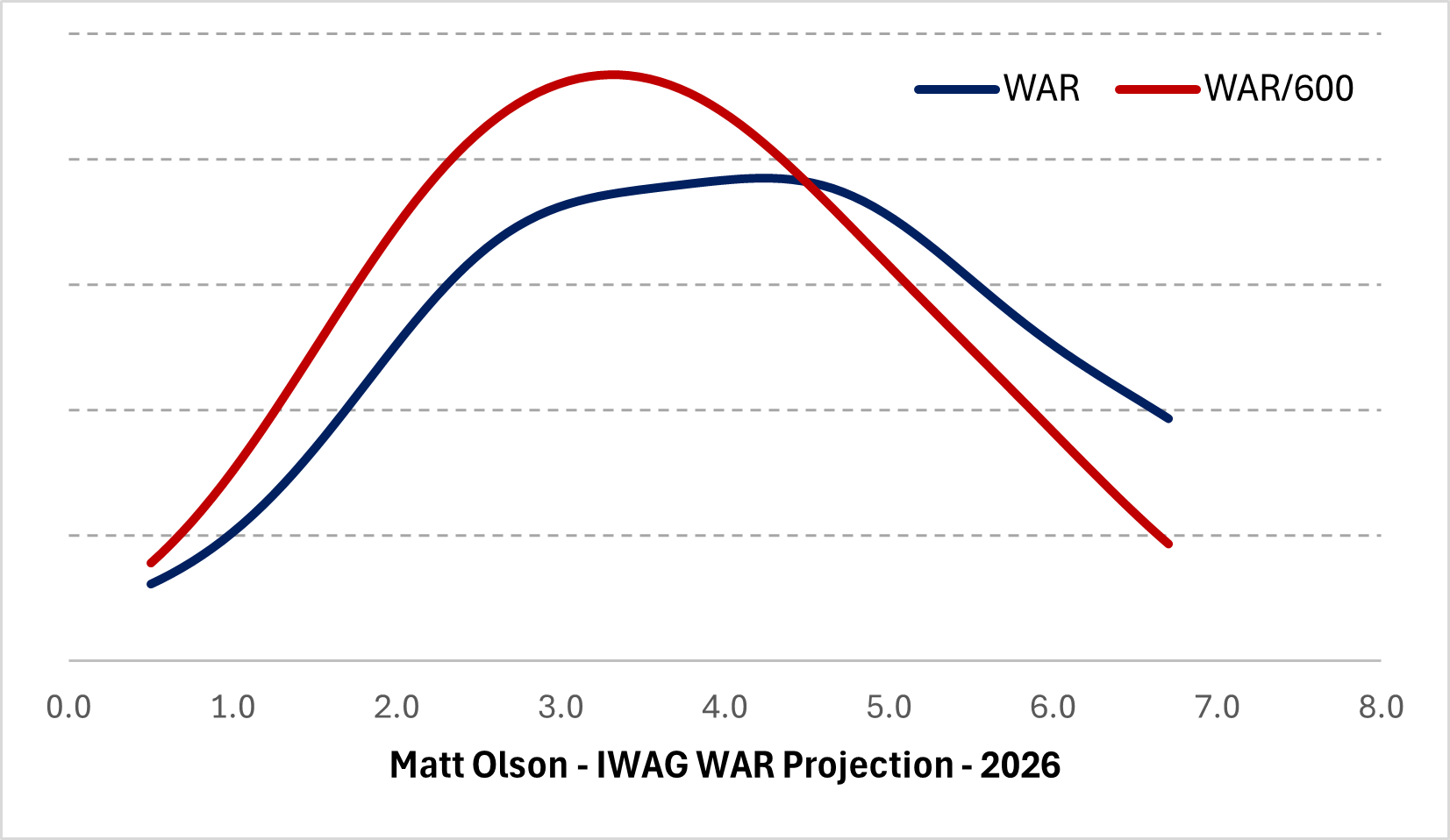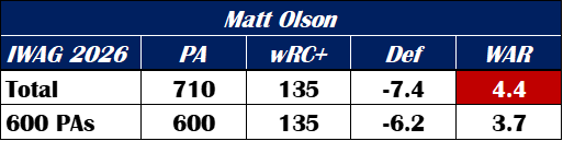 This is either surprising or not surprising relative to the first paragraph in this section, depending on how much you care about the details. Is Olson expected to be well above average in general? Yes. IWAG sees Olson as hitting marginally better than his career rate but basically just reflecting composite Matt Olson to date. The flavor is the same as whatever Steamer-ZiPS-blend-plus-2025-stuff-that-happened is on the FanGraphs player page right now, but it’s a bit sharper or tangier, with a five-point spread in wRC+, which adds up over 700+ PAs.