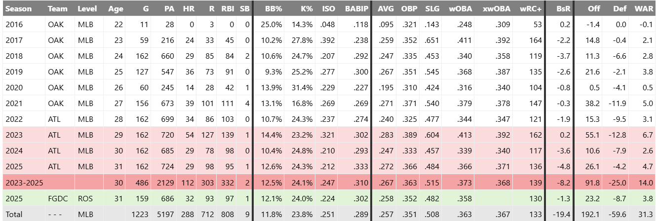 Olson has played in parts of ten MLB seasons and will play in his age-32 season in 2026. He has amassed 31.3 fWAR in 5,197 PAs to date, a rate of 3.6 fWAR/600 PAs — though in Olson’s case, it’s worth noting that he’s substantially exceeded 600 PAs in each of his last five seasons. He has a 133 wRC+ with no notable xwOBA underperformance (.363 wOBA, .367 xwOBA). His value tends to be minorly held back by poor baserunning (half a win lost in 2025, a bit less in 2024). Defensively, he’s at around +3 OAA-based runs per 1,000 innings at first base, which doesn’t even come close to offsetting the negative positional adjustment at first base. He’s had a few superior defensive seasons (2019, 2025) and just one weirdly bad one (2023). Fundamentally, though, Olson’s value largely varies with how well he hits.