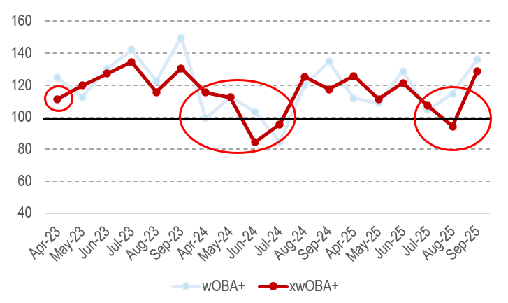 He rebounded to essentially his career mark in 2025, a 136 wRC+, with his 4.7 fWAR boosted by a great defensive year. Olson, like many hitters, tends to vacillate in effectiveness over the course of the season; in 2025, he seemed to be the only guy making the Braves’ new passive-even-if-not-intentionally-so approach work for him, until changing things around with the adjustment period that entailed, and going on a power binge late in the year when it was clear that there was no reason to stick with the reinvented wheel of an approach. Olson’s overall stats in 2025 will show a much more passive hitter than any previous iteration of himself in a Braves uniform, but the walks, as well as increased selectivity leading to improved contact quality, helped him pull himself out of his 2024 doldrums.
