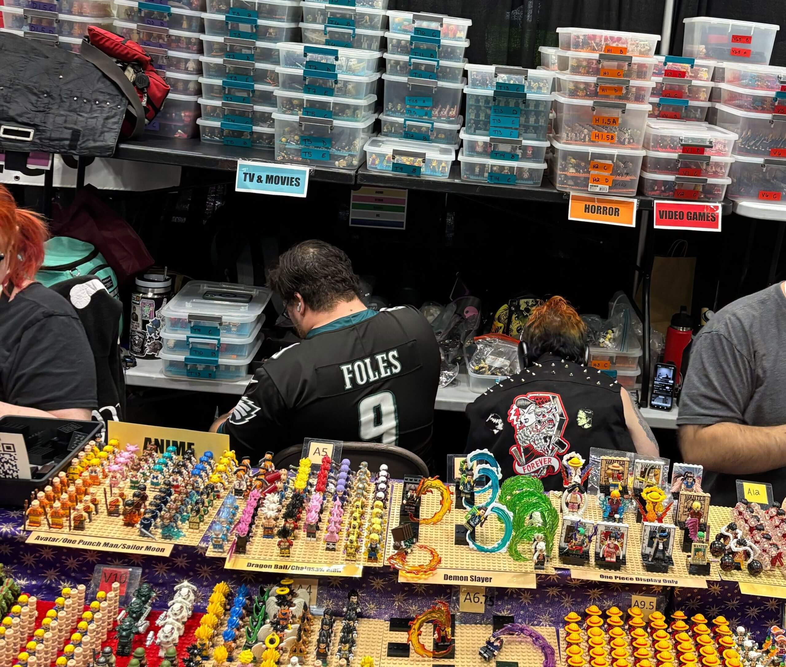 On Thursday, the first day of the four-day convention, a clear theme quickly emerged: Philadelphia sports fans were everywhere. Amidst the many Batmen, Spider-Men and K-Pop Demon Hunters, there was a variety of Phillies and Eagles garb on display. The first example we spotted was a man wearing a 2024 NFC champions hoodie (obviously someone who committed to a purchase too soon and is determined to still get his wear out of it. Then came the jerseys — a black Eagles Saquon Barkley, a home Jordan Mailata draped over a ladder as a vendor showed off the “Go Birds!” T-shirt he had on underneath it. Another vendor wore a Nick Foles jersey as he sorted through knockoff Lego character figures. There were also an assortment of Phillies hats and tops.