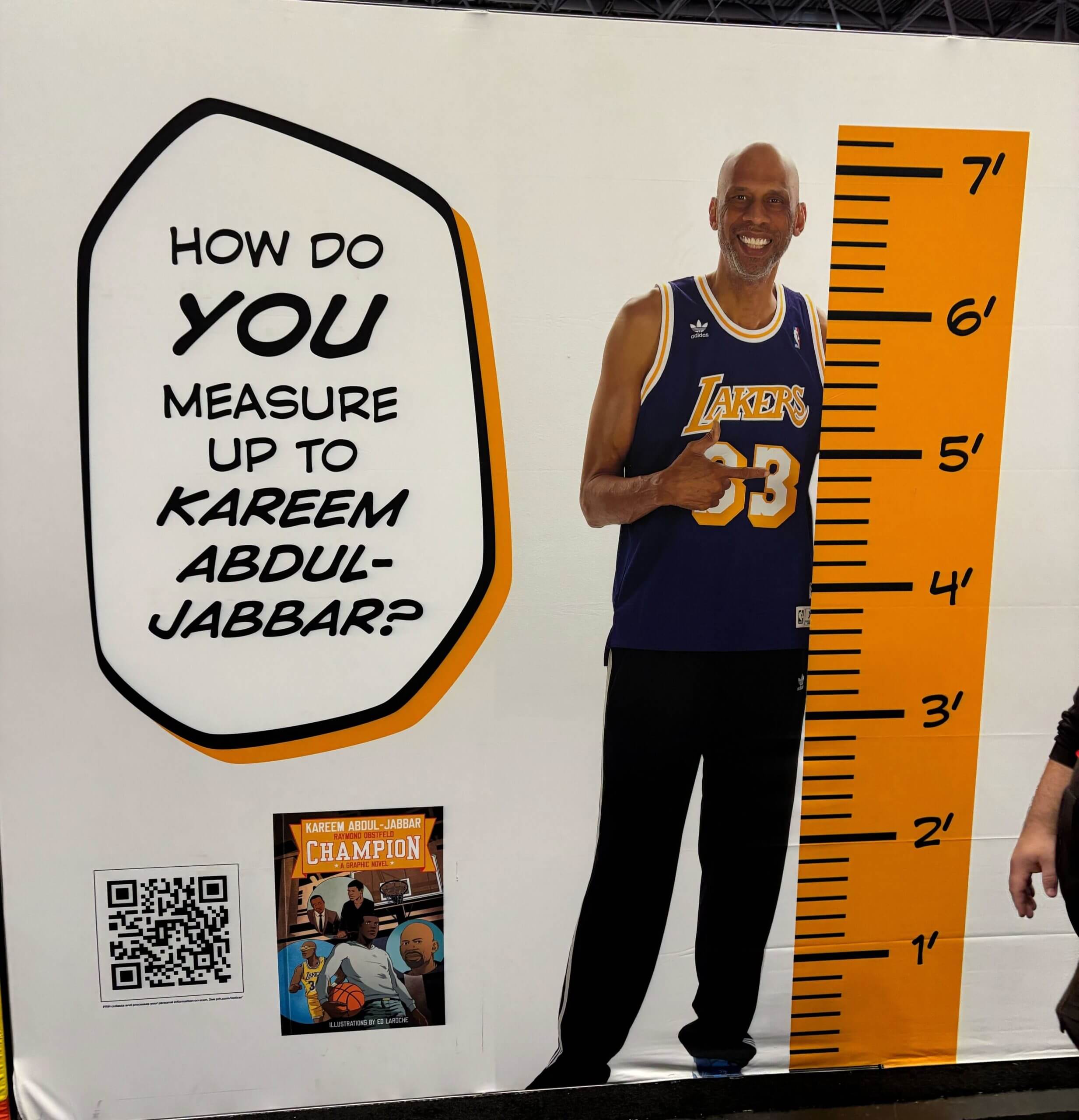 The Penguin Books booth promoted a Kareem Abdul-Jabbar graphic novel with a life-size image of the hall-of-famer.